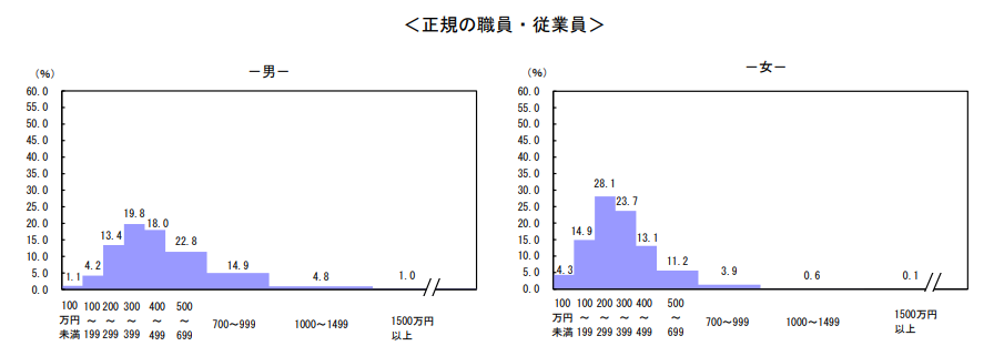 男性は約半数が年収500万円を超えているにも関わらず、女性の場合はわずか15%ほど。高所得者の割合の差も歴然となっています。